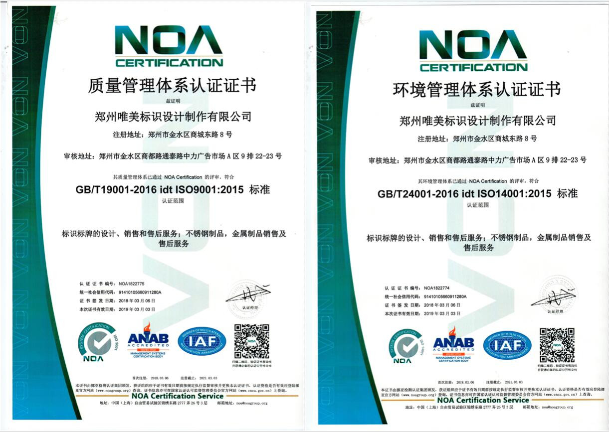 生產制作的每一件產品的原材料嚴格按照國家標準執行,產品質保最長10年;免費上門服務、免費深化標識設計方案、免費鄭州市內送貨上門;口碑廣為流傳、70%客戶來自于老客戶轉介紹;